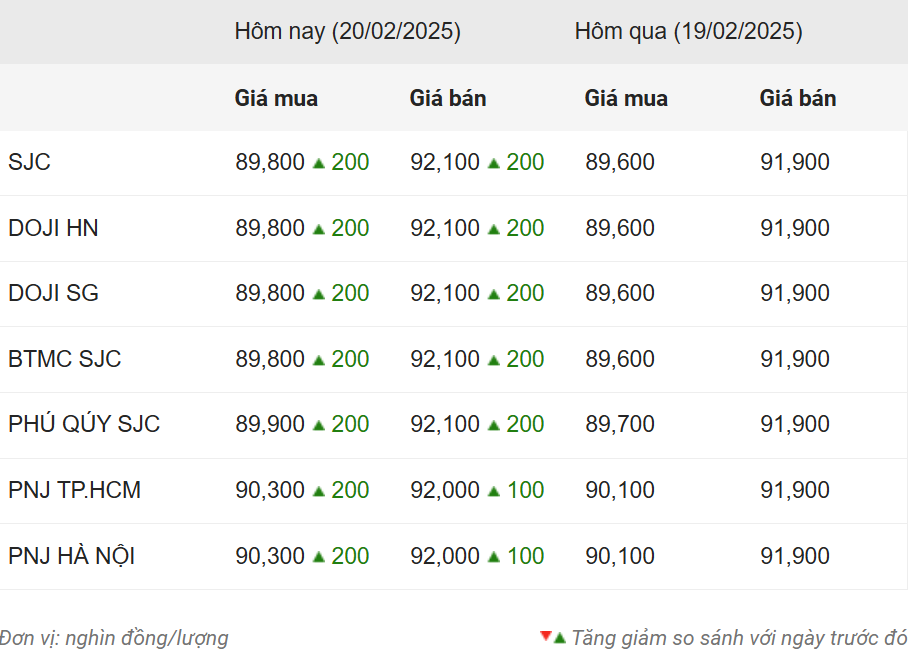 Trên thị trường quốc tế, cập nhật thời điểm 10h09 ngày 19/2 (giờ Việt Nam), giá vàng thế giới ở mức 2.942 USD/ounce, tăng 12,7 USD so với phiên trước. Quy đổi theo tỷ giá Vietcombank, giá vàng hiện đạt 90,7 triệu đồng/lượng (đã bao gồm thuế, phí). Như vậy, nếu so với giá vàng miếng SJC bán ra là 92,1 triệu đồng/lượng, thì chênh lệch giữa giá vàng trong nước và giá vàng thế giới khoảng 1,4 triệu đồng/lượng.