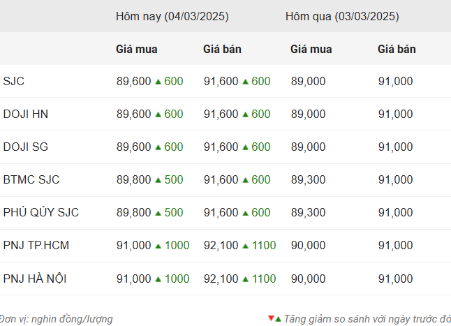 Cụ thể, SJC niêm yết giá vàng nhẫn ở mức 89,6 – 91,5 triệu đồng/lượng, mua vào và bán ra cùng tăng 600.000 đồng/lượng so với chốt phiên ngày 3/3.