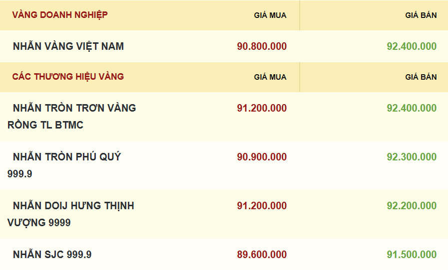 Tại Phú Quý, giá vàng nhẫn hiện ở mức 90,9 – 92,3 triệu đồng/lượng, tăng 600.000 đồng/lượng chiều mua - bán so với cuối ngày hôm qua.