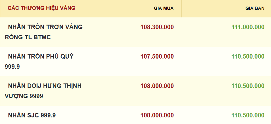 Giá vàng nhẫn tròn Phú Quý 999,9 được niêm yết ở mức 107,5 - 110,5 triệu đồng/lượng (mua-bán), tăng 3 triệu đồng/lượng chiều mua và 2,5 triệu đồng/lượng chiều bán so với phiên trước.
