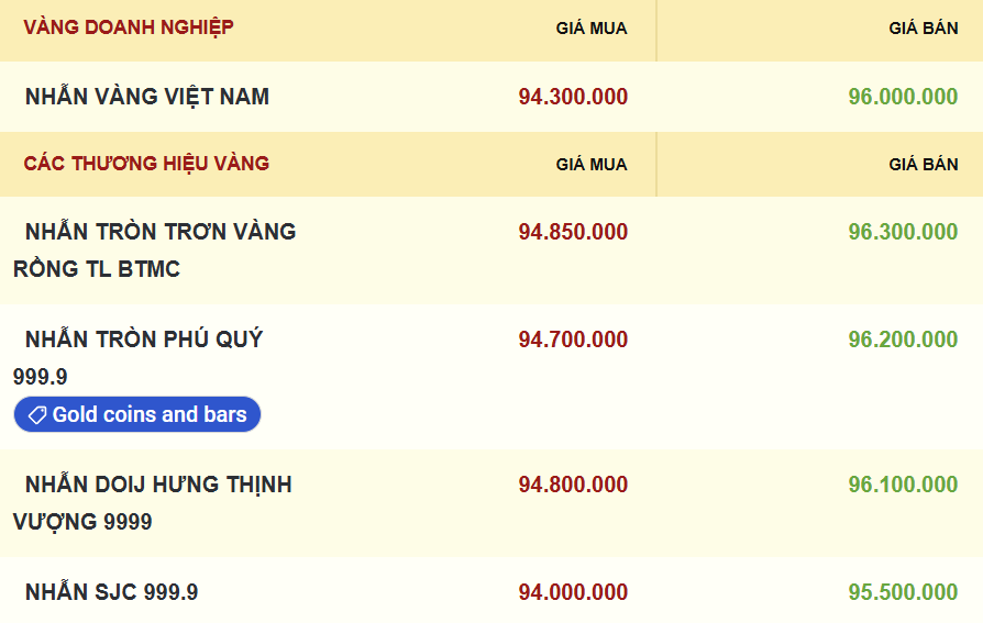 Tại các thương hiệu vàng khác, giá vàng nhẫn tròn trơn đang được niêm yết vượt mốc 96 triệu đồng/lượng, cụ thể: DOJI niêm yết giá vàng nhẫn ở mức 94,8 - 96,1 triệu đồng/lượng (mua vào - bán ra); Phú Quý niêm yết giá vàng nhẫn tròn trơn ở mức 94,7 - 96,2 triệu đồng/lượng (mua vào - bán ra); Bảo Tín Minh Châu niêm yết giá nhẫn tròn trơn ở mức 94,85 - 96,3 triệu đồng/lượng (mua vào - bán ra) - mốc cao nhất trong lịch sử. Theo ghi nhận, giá bán ra của vàng nhẫn tròn trơn tại các thương hiệu này đang cao hơn giá vàng miếng SJC từ 500.000 - 700.000 đồng/lượng.