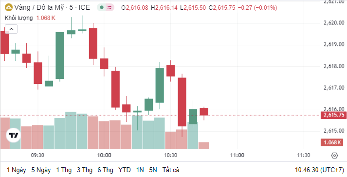 Hôm nay (ngày 9/10), vào lúc 10h45 (giờ Việt Nam), giá vàng thế giới đứng ở mức 2.615,75 USD/ounce, giảm 27,53 USD so với phiên trước.