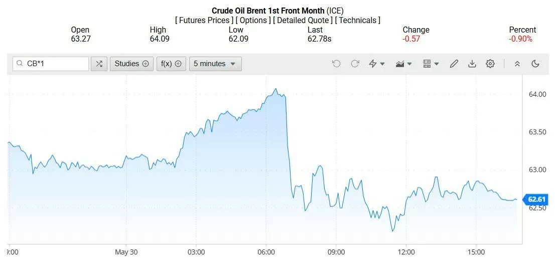 Ghi nhận trên Oilprice lúc 4h30 ngày 02/06/2025 (theo giờ Việt Nam), giá dầu Brent ở mốc 62,61 USD/thùng, giảm 0,90% (tương đương giảm 0,57 USD/thùng).
