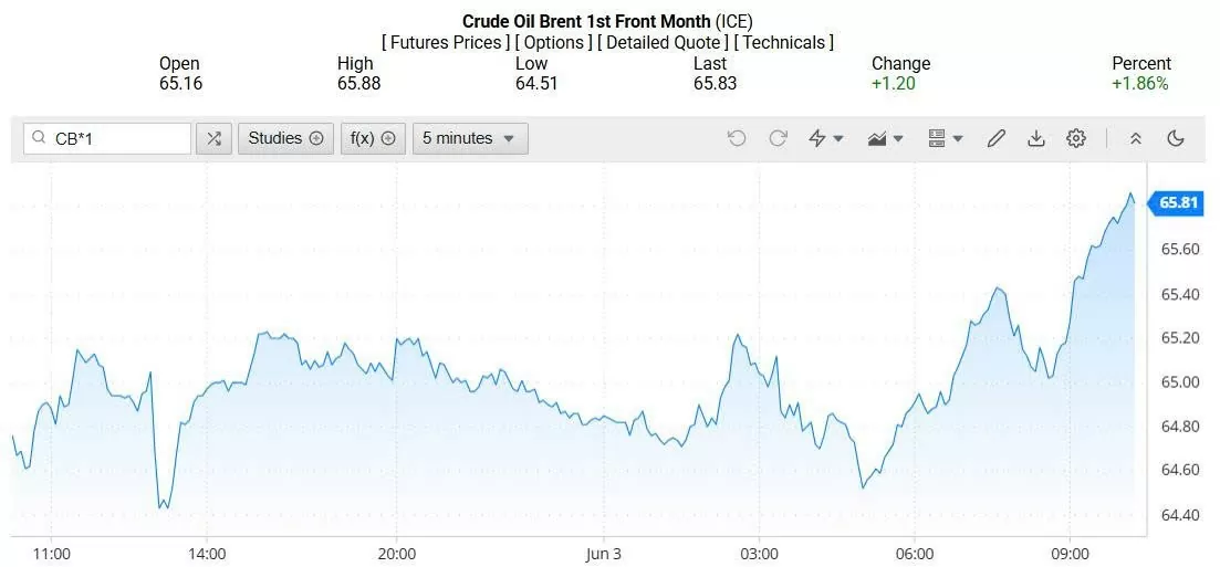 Ghi nhận trên Oilprice lúc 4h30 ngày 04/06/2025 (theo giờ Việt Nam), giá dầu Brent ở mốc 65,81 USD/thùng, tăng 1,86% (tương đương tăng 1,20 USD/thùng).