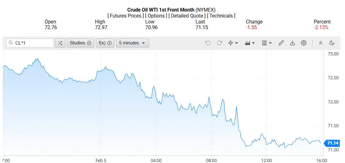 Ghi nhận trên Oilprice lúc 4h30 ngày 06/02/2025 (theo giờ Việt Nam), giá dầu WTI ở mốc 71,14 USD/thùng, giảm 2,13% (tương đương giảm 1,55 USD/thùng).