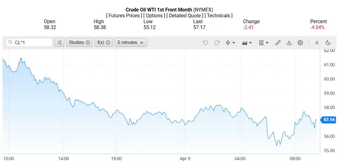 Ghi nhận trên Oilprice lúc 4h30 ngày 10/04/2025 (theo giờ Việt Nam), giá dầu WTI ở mốc 57,14 USD/thùng, giảm 4,04% (tương đương giảm 2,41 USD/thùng).