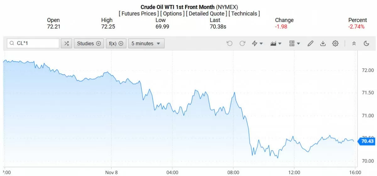 Ghi nhận trên Oilprice lúc 5h ngày 11/11/2024 (theo giờ Việt Nam), giá dầu WTI ở mốc 70,43 USD/thùng, giảm 2,74% (tương đương giảm 1,98 USD/thùng).