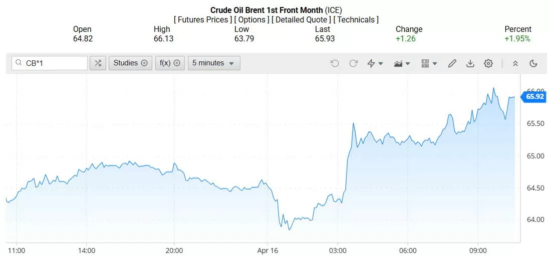 Ghi nhận trên Oilprice lúc 4h30 ngày 17/04/2025 (theo giờ Việt Nam), giá dầu Brent ở mốc 65,92 USD/thùng, tăng 1,95% (tương đương tăng 1,26 USD/thùng).