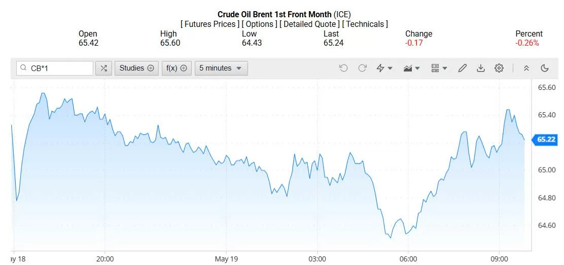 Ghi nhận trên Oilprice lúc 4h30 ngày 20/05/2025 (theo giờ Việt Nam), giá dầu Brent ở mốc 65,22 USD/thùng, giảm 0,26% (tương đương giảm 0,17 USD/thùng).