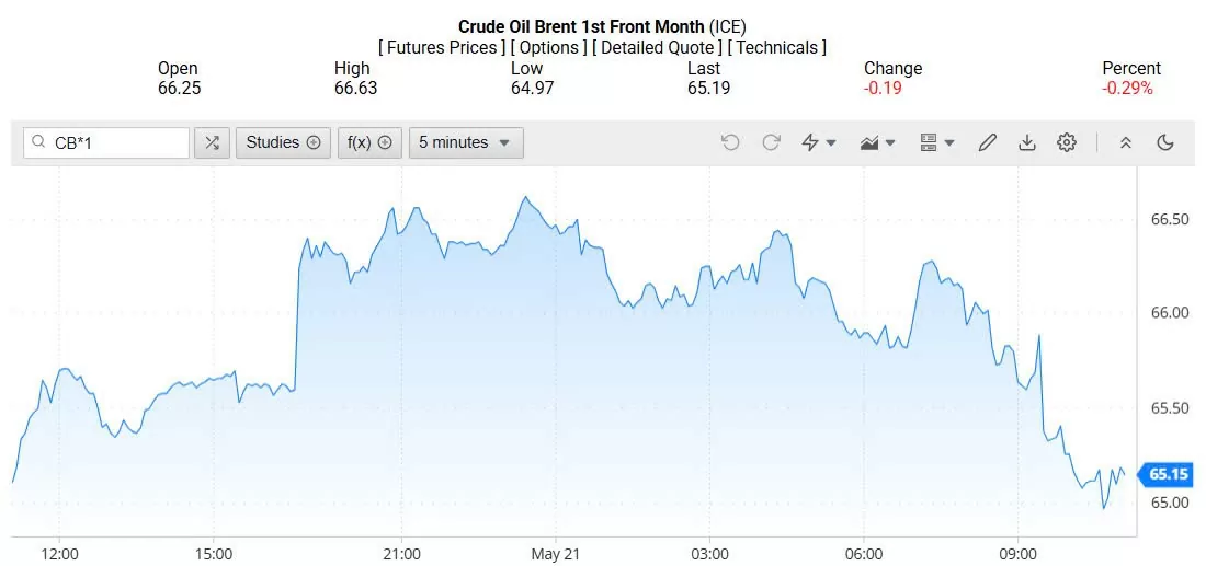 Ghi nhận trên Oilprice lúc 4h30 ngày 22/05/2025 (theo giờ Việt Nam), giá dầu Brent ở mốc 65,15 USD/thùng, giảm 0,29% (tương đương giảm 0,19 USD/thùng).