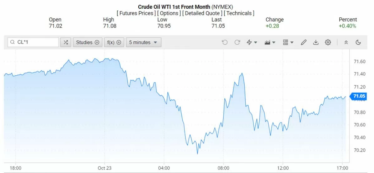 Ghi nhận trên Oilprice lúc 5h ngày 24/10/2024 (theo giờ Việt Nam), giá dầu WTI ở mốc 71,05 USD/thùng, tăng 0,40% (tương đương tăng 0,28 USD/thùng).