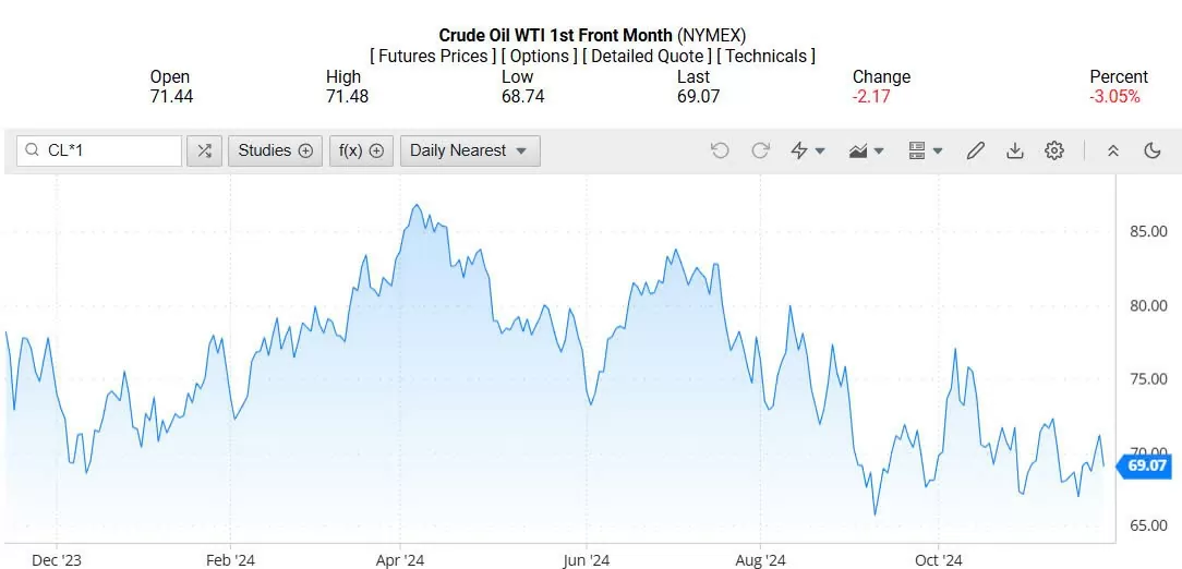 Ghi nhận trên Oilprice lúc 5h ngày 26/11/2024 (theo giờ Việt Nam), giá dầu WTI ở mốc 69,07 USD/thùng,giảm 3,05$% (tương đương tăng 2,17 USD/thùng).