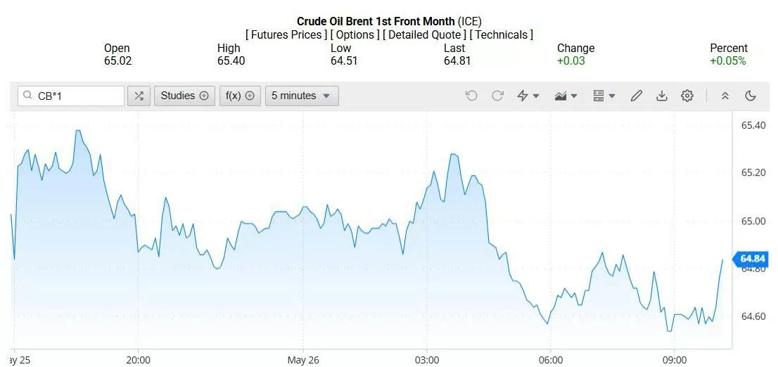 Ghi nhận trên Oilprice lúc 4h30 ngày 27/05/2025 (theo giờ Việt Nam), giá dầu Brent ở mốc 64,84 USD/thùng, tăng 0,05% (tương đương tăng 0,03 USD/thùng).