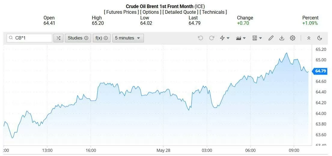 Ghi nhận trên Oilprice lúc 4h30 ngày 29/05/2025 (theo giờ Việt Nam), giá dầu Brent ở mốc 64,79 USD/thùng, tăng 1,09% (tương đương tăng 0,70 USD/thùng).