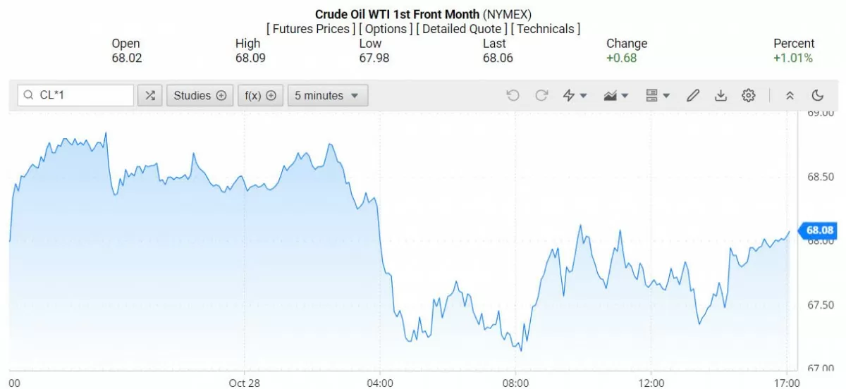 Ghi nhận trên Oilprice lúc 5h ngày 29/10/2024 (theo giờ Việt Nam), giá dầu WTI ở mốc 68,08 USD/thùng, tăng 1,01% (tương đương tăng 0,68 USD/thùng).