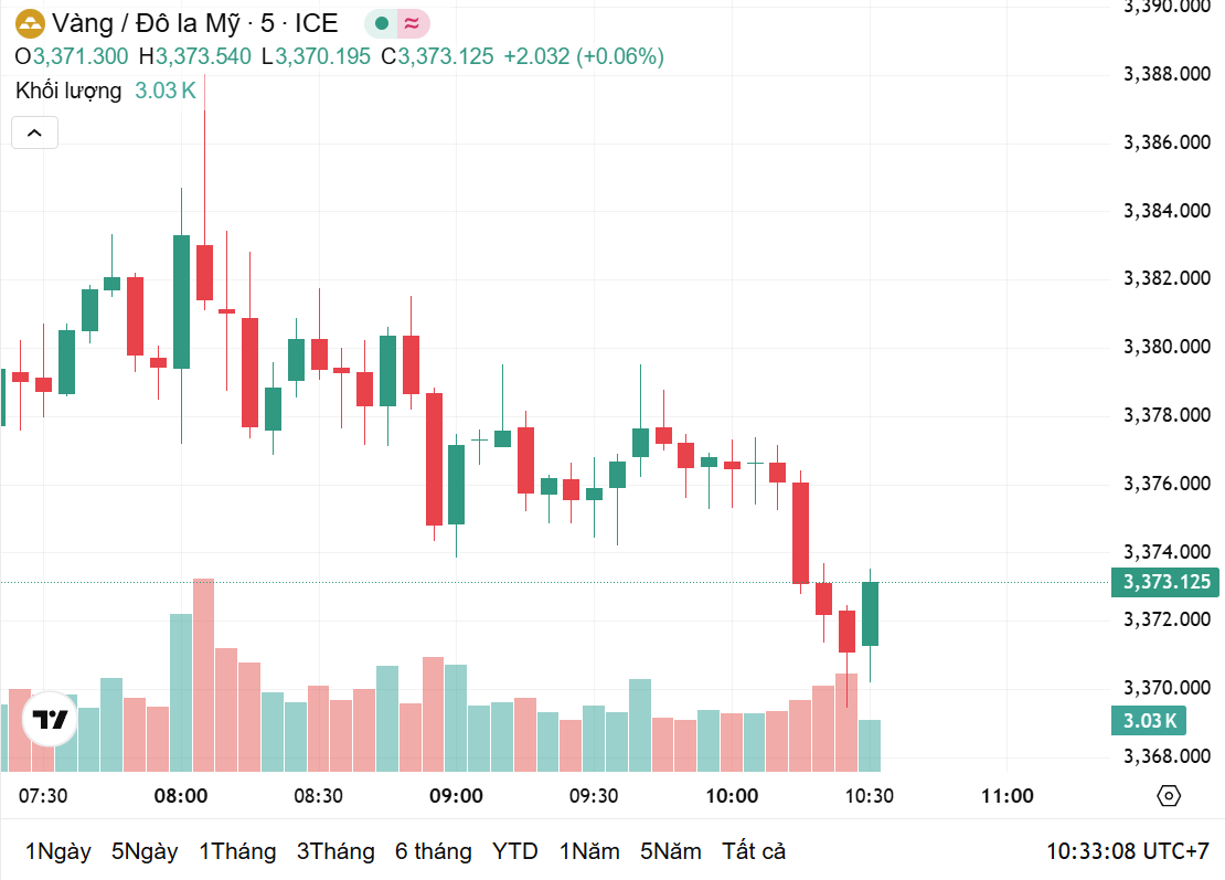 Giá vàng thế giới giảm vào phiên giao dịch vừa qua, nhưng vẫn dao động quanh mức 3.380 USD/ounce, thu hẹp mức lỗ từ phiên trước do được hỗ trợ bởi sức hấp dẫn của nơi trú ẩn an toàn trong bối cảnh căng thẳng địa chính trị leo thang.