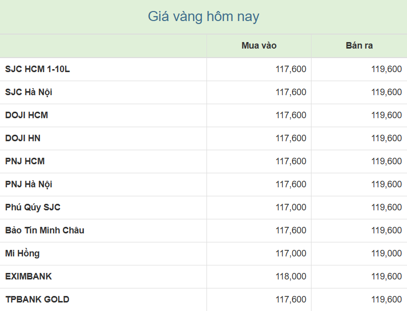 Công ty Vàng bạc đá quý Sài Gòn (SJC), Tập đoàn Vàng bạc Đá quý DOJI, PNJ và Bảo Tín Minh Châu cùng niêm yết giá vàng miếng mua vào-bán ra ở mức 117,6-119,6 triệu đồng/lượng, đứng yên ở cả chiều mua vào và chiều bán ra so chốt phiên trước.
