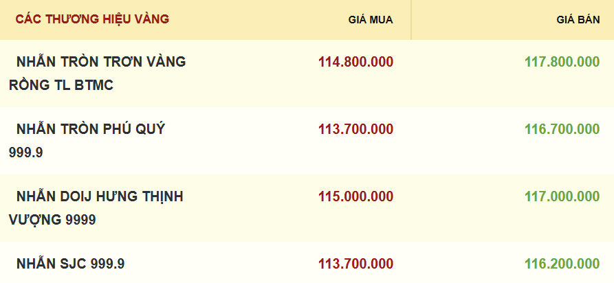 Cùng xu hướng "bất động", giá vàng nhẫn và vàng trang sức 99,99 cũng được giao dịch ở mức 113,7 triệu đồng/lượng mua vào và 116,2 triệu đồng/lượng bán ra, không thay đổi so với hôm qua.