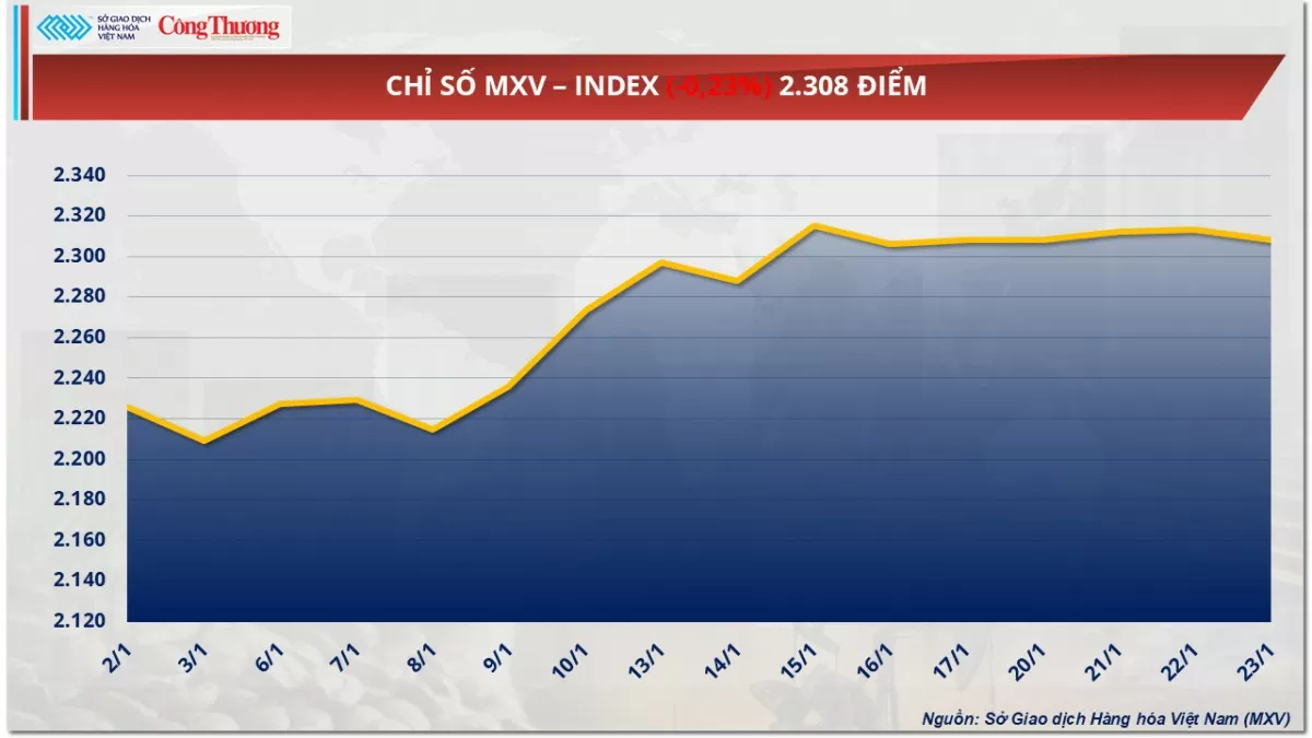 Sở Giao dịch Hàng hóa Việt Nam (MXV) cho biết, lực bán chiếm ưu thế trong ngày giao dịch hôm qua đã chấm dứt chuỗi tăng 4 phiên liên tiếp của chỉ số MXV-Index. Đóng cửa, chỉ số này giảm không nhẹ xuống mức 2.308 điểm. Đáng chú ý, sắc đỏ tràn ngập trên thị trường năng lượng và kim loại. Trong đó, giá dầu thô đang dần xa khỏi mốc 80 USD/thùng. Bên cạnh đó, giá kim loại quý cũng đồng loạt suy yếu trong bối cảnh thị trường thận trọng hơn để đánh giá tác động của các chính sách năng lượng và thuế quan của ông Trump đề xuất lên tăng trưởng kinh tế toàn cầu.
