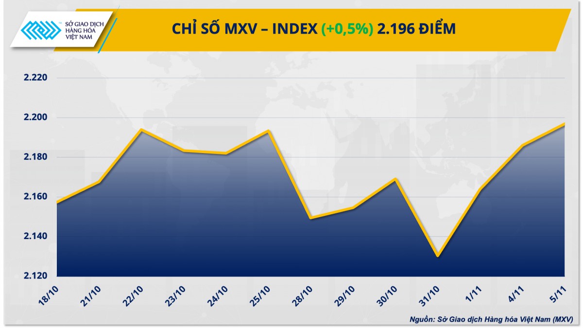 Theo Sở Giao dịch Hàng hóa Việt Nam (MXV), lực mua tiếp tục chiếm ưu thế trên thị trường hàng hóa nguyên liệu thế giới trong ngày giao dịch hôm qua (5/11).