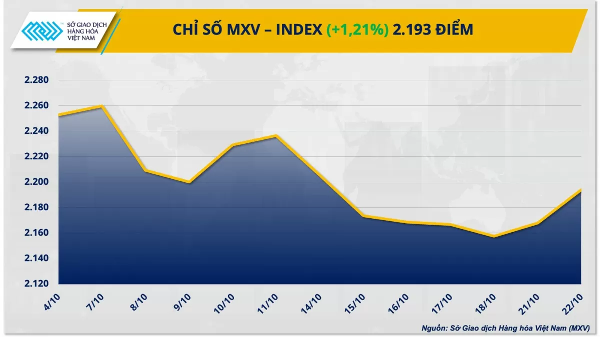 Theo Sở Giao dịch Hàng hóa Việt Nam (MXV), thị trường hàng hóa nguyên liệu thế giới đón nhận lực mua tích cực trong phiên giao dịch ngày hôm qua (22/10).