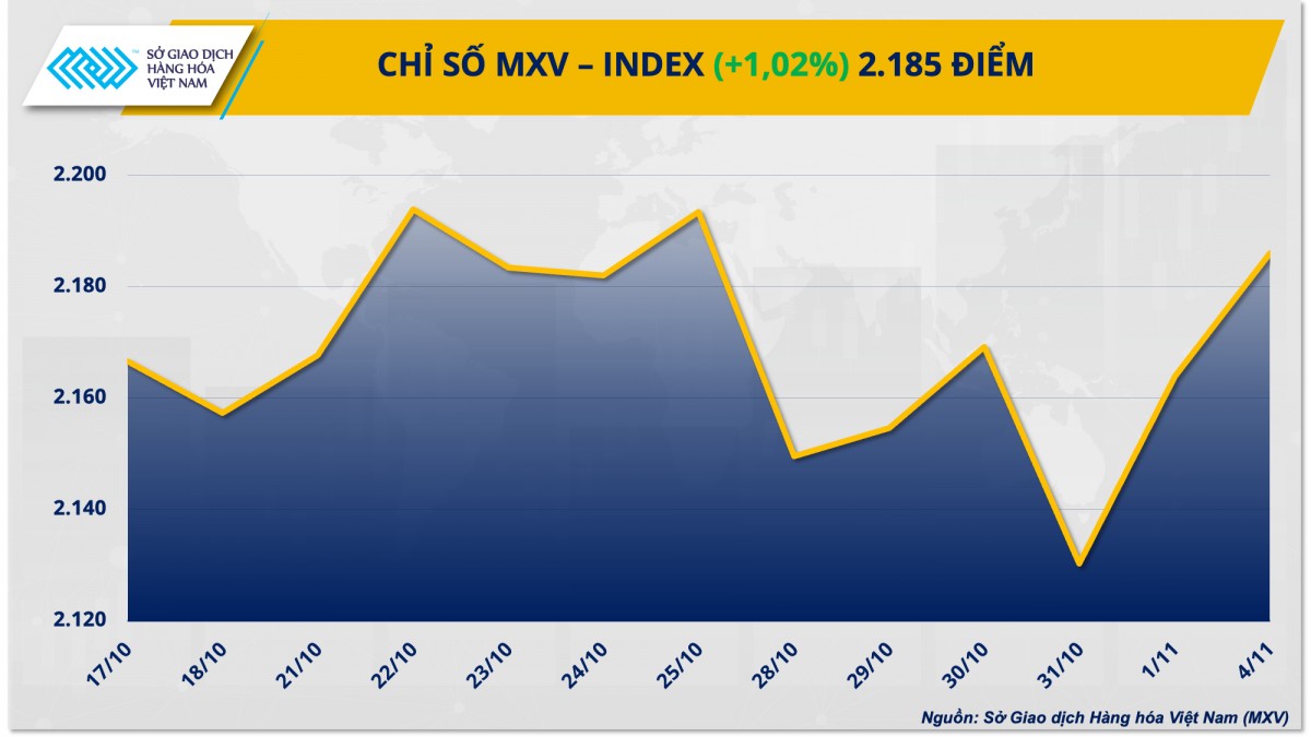 Theo MXV, sắc xanh áp đảo trên bảng giá hàng hóa nguyên liệu thế giới trong ngày giao dịch đầu tuần (4/11) kéo chỉ số MXV-Index tăng 1,02% lên 2.185 điểm.