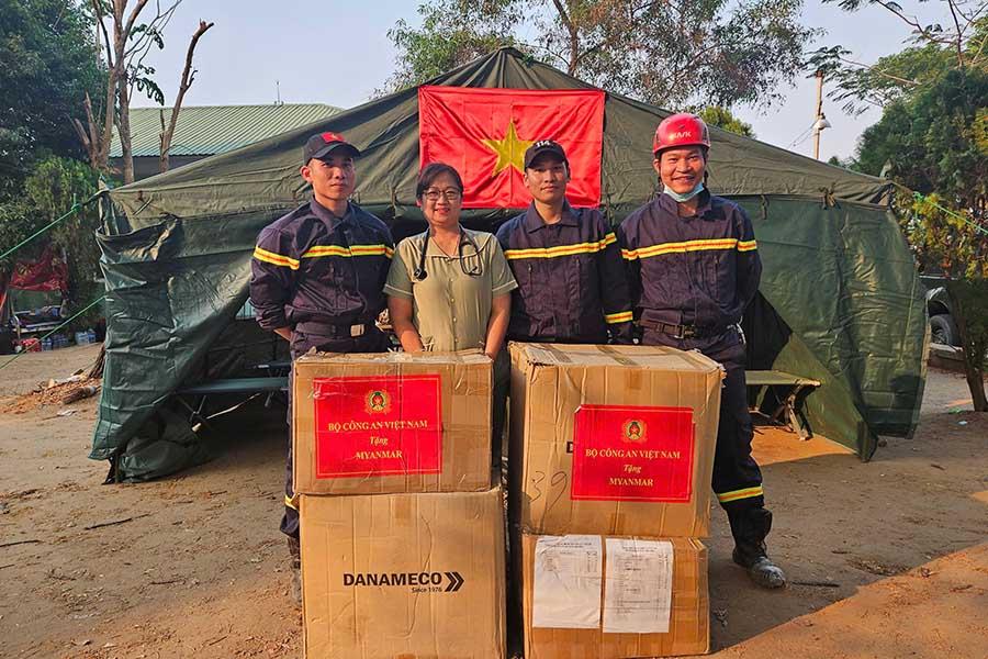 Song song với tổ công tác thực hiện nhiệm vụ tìm kiếm nạn nhân tại khách sạn Jade City, một tổ công tác khác của đoàn cứu hộ Bộ Công an Việt Nam đã tập hợp trang thiết bị là nhà bạt, giường cùng vật tư y tế, thuốc và các nhu yếu phẩm thiết yếu khác như mỳ tôm, lương khô, nước sạch... gửi tặng người dân Myanmar.