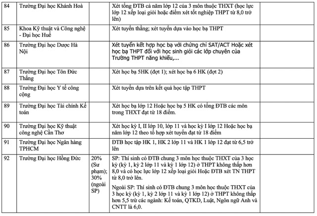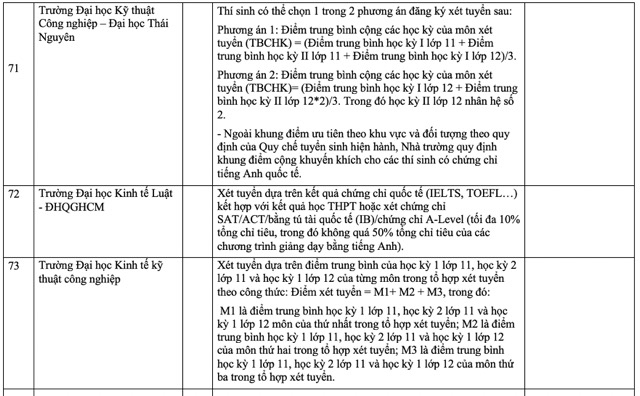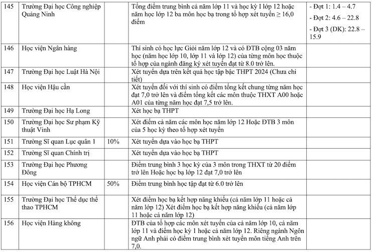 Theo đó, trường xét tuyển dựa vào tổng điểm trung bình năm lớp 10, năm lớp 11 và học kì 1 năm lớp 12 các môn trong tổ hợp xét tuyển tương ứng (thí sinh đã tốt nghiệp trước năm 2024 cũng tính 05 học kỳ như trên), kết hợp với ưu tiên cộng điểm các đối tượng: Học sinh giỏi cấp tỉnh, thành phố; học sinh học tại các trường chuyên; học sinh có học lực xếp loại giỏi năm lớp 10, 11 và học kì 1 năm lớp 12; chứng chỉ ngoại ngữ quốc tế.