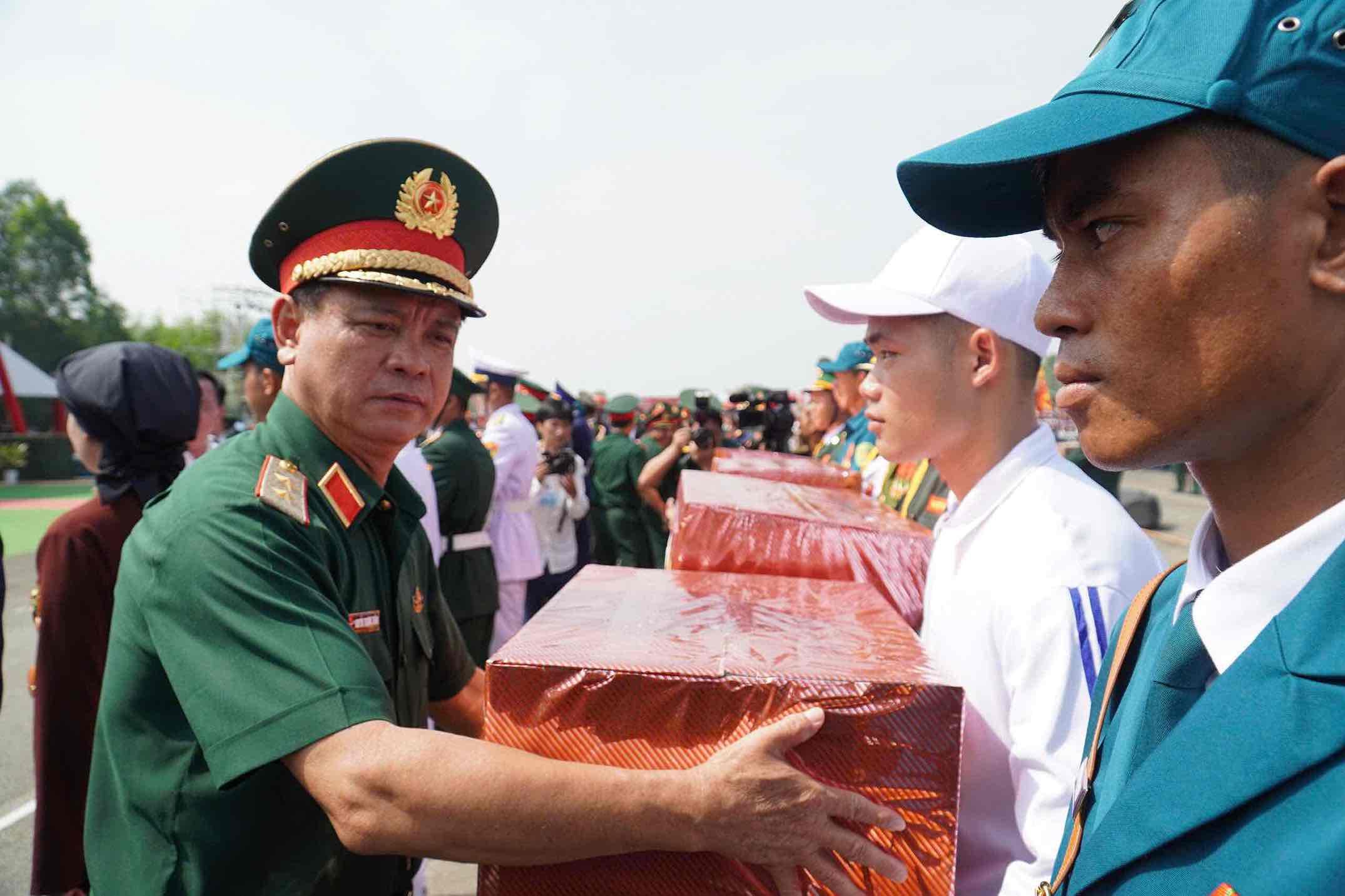 Lãnh đạo Bộ quốc phòng, Quân khu 7, UBND tỉnh Đồng Nai tặng quà các khối diễu binh, diễu hành. Ảnh: Anh Tú