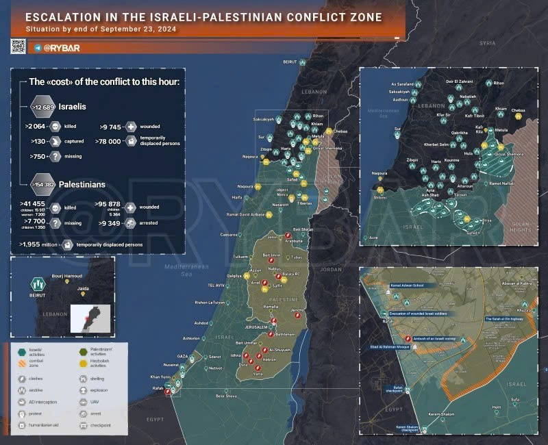 | Bản đồ xung đột Israel - Hamas ngày 23/9. (Ảnh: Rybar) |