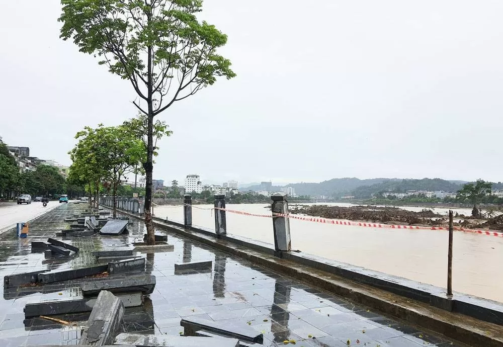 | Lan can dọc bờ kè sông Hồng trên địa bàn Lào Cai bị hư hỏng. Ảnh: CTTĐTLC |