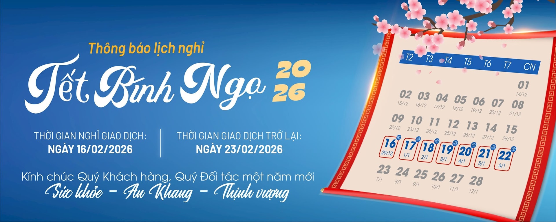 Các giao dịch chứng khoán có chu kỳ thanh toán T+2 thực hiện tại các ngày 12/2/2026 và 13/2/2026 sẽ được thanh toán lần lượt vào các ngày 23/2/2026 và 24/2/2026.
