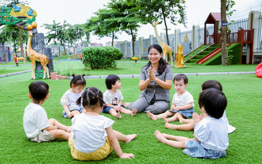 | Cô trò Trường Mầm non An Khánh B (An Khánh, Hà Nội) trong một hoạt động vui chơi ngoài trời. Ảnh: TG |