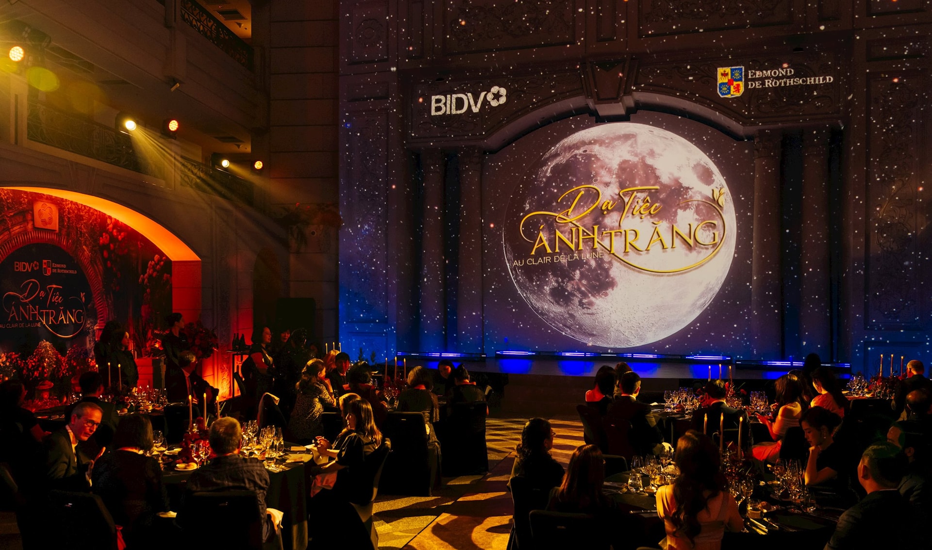 “Dạ tiệc ánh trăng” là sự kiện nằm trong chuỗi các hoạt động dành riêng cho khách hàng cá nhân cao cấp của BIDV. Với thiết kế không gian được lấy cảm hứng từ kiến trúc cổ điển mang đậm phong cách Pháp và sự kết hợp tinh tế giữa nghệ thuật, âm nhạc và thời trang, “Dạ tiệc Ánh trăng” mang lại những trải nghiệm độc đáo, đẳng cấp. Khách mời còn được thưởng thức hương vị tuyệt vời từ những dòng rượu vang Edmond de Rothschild hảo hạng - nơi mỗi chai rượu vang đều mang trong mình dấu ấn thời gian, sự tinh túy của từng vùng đất nơi nho được ươm trồng, kết trái cùng tâm huyết sáng tạo và sự kỳ công của các nghệ nhân.