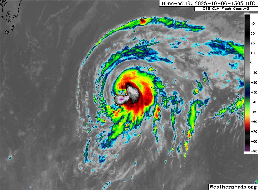 Hình ảnh vệ tinh cho thấy tâm bão hiện nằm phía tây quần đảo Ogasawara, với các dải mây đối lưu đang tổ chức chặt chẽ hơn khi hệ thống tiếp tục tăng cường. Dự kiến đến chiều 8.10, gió vùng gần tâm bão có thể đạt tới 162 km/h, đủ tiêu chuẩn một cơn bão rất mạnh theo thang phân loại của Nhật Bản.