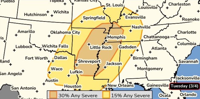 Theo Trung tâm Dự báo Bão (SPC), các bang Louisiana, Arkansas và Mississippi nằm trong vùng có nguy cơ cao nhất (cấp 3 trên 5) xảy ra lốc xoáy. Các chuyên gia cảnh báo lốc xoáy mạnh cấp EF2 trở lên có thể xuất hiện, gây thiệt hại nghiêm trọng.