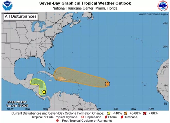 2 áp thấp tiềm tàng mạnh lên thành bão sau siêu bão Milton. Ảnh: NHC