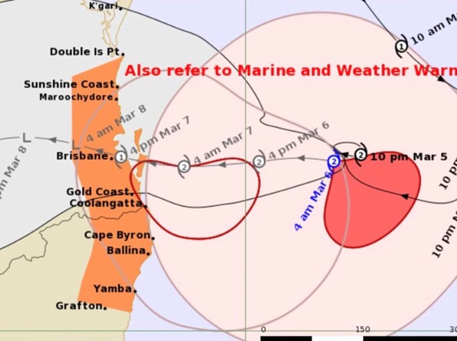 Sáng 6.3, cơn bão mạnh cấp 2 này đang cách Brisbane 325 km về phía đông và cách Gold Coast 300 km về phía đông. Bão di chuyển theo hướng tây - tây nam với tốc độ 7 km/h.